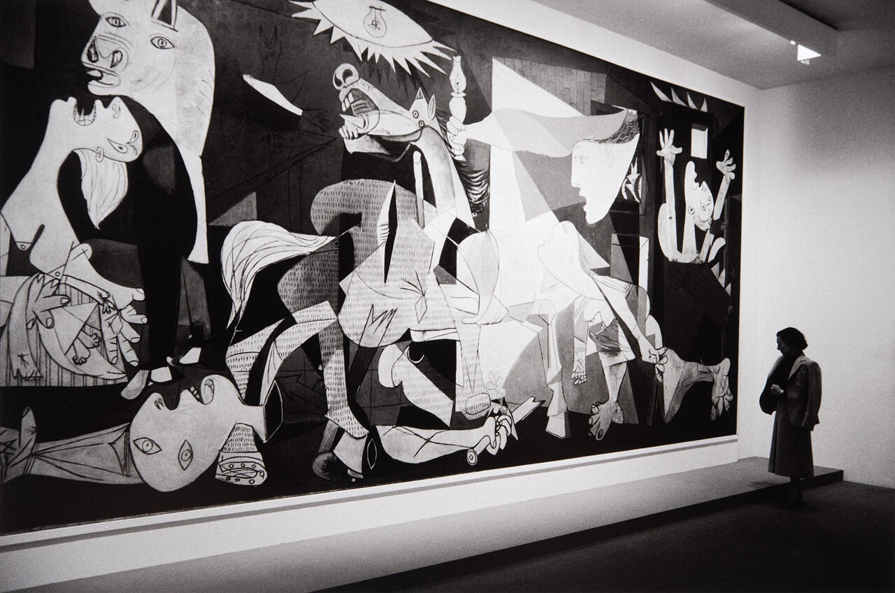 DescriptionImage of woman standing next to Picasso's Guernica while on exhibit.Copyright© Harry Ransom Center, The University of Texas at Austin