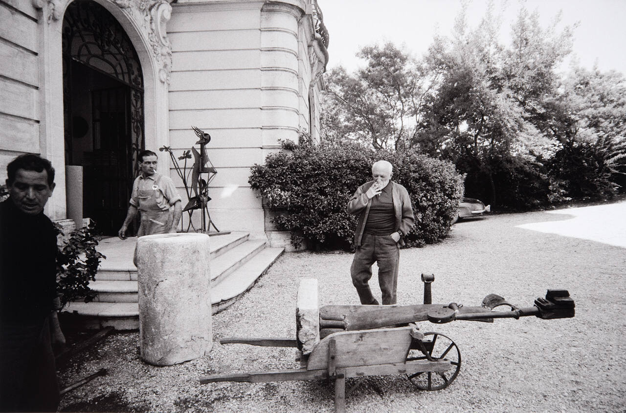 DescriptionImage of Picasso looking at his sculpure in a wheel barrow.Copyright© Harry Ransom Center, The University of Texas at Austin