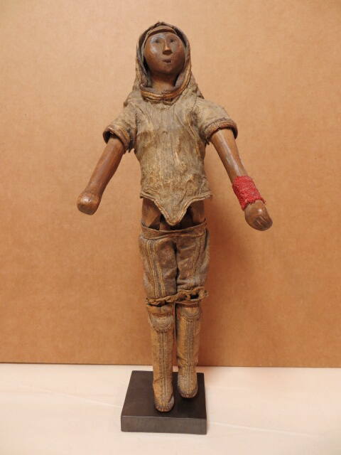 DescriptionArticulated wooden doll wearing a leather parka with hood and short sleeves, knee length pants, high leather boots, a piece of red cloth is wrapped around his proper left forearm.