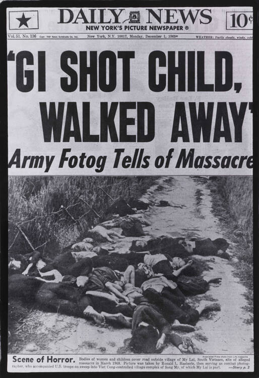 DescriptionImage of a New York newspaper, Daily News, showing dead bodies in Vietnam along with the headline " 'GI SHOT CHILD, WALKED AWAY' ".Copyright© Donald Blumberg