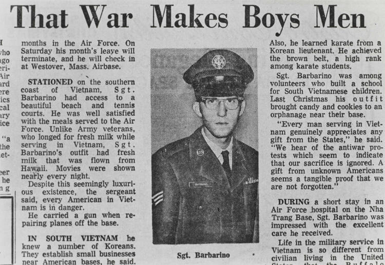 DescriptionImage of a newspaper with a photograph of a soldier and the headline "That War makes Boys Men".Copyright© Donald Blumberg