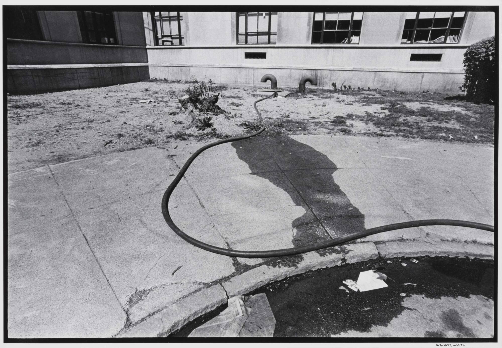 DescriptionImage of a water hose coming up out of the ground and laying across sidewalk.Copyright© Donald Blumberg