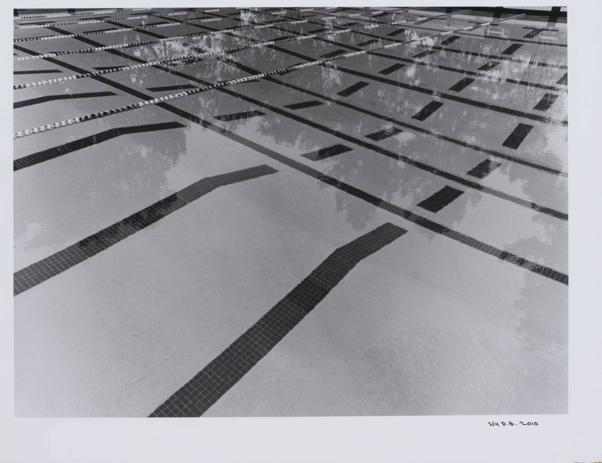 DescriptionImage of a swimming pool with dark lane markers and reflections of trees.Copyright© Donald Blumberg