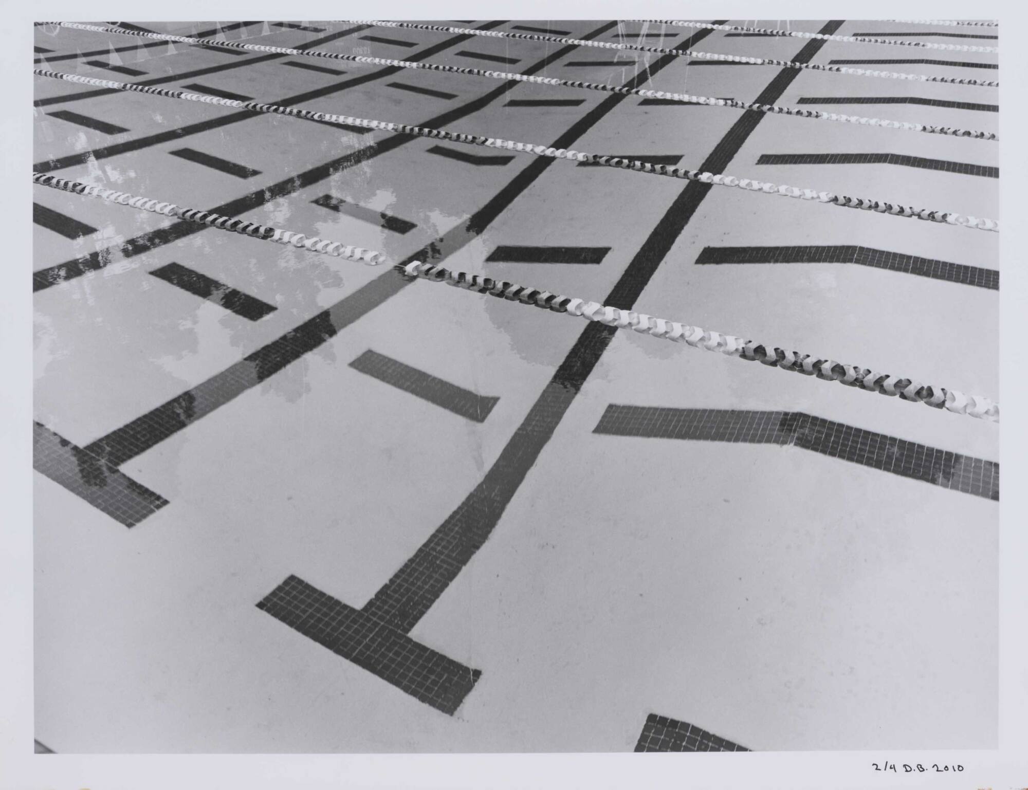 DescriptionImage of a swimming pool with dark lane markers and reflections of trees.Copyright© Donald Blumberg