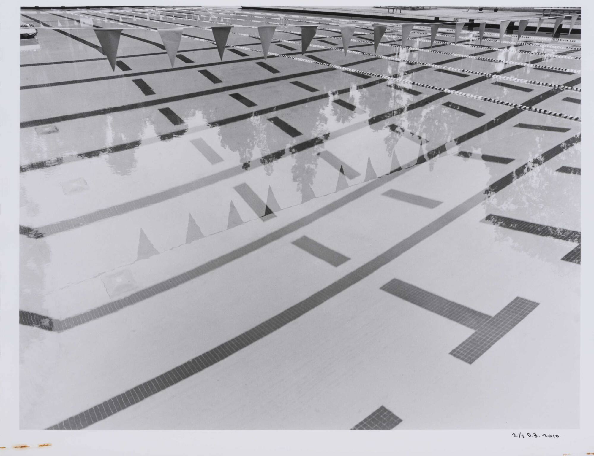DescriptionImage of a swimming pool with dark lane markers below and a string of flags above.Copyright© Donald Blumberg