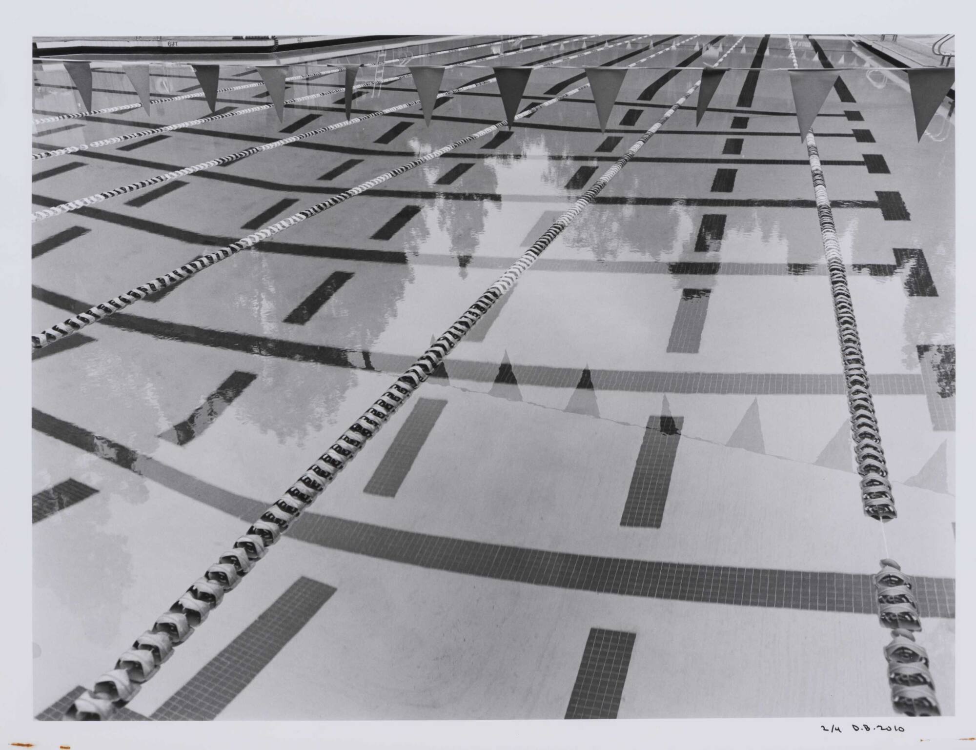 DescriptionImage of a swimming pool with dark lane markers below and a string of flags above.Copyright© Donald Blumberg