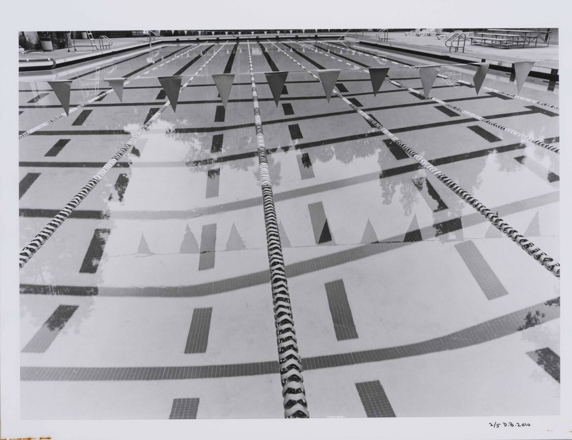 DescriptionImage of a swimming pool with dark lane markers below and a string of flags above.Copyright© Donald Blumberg