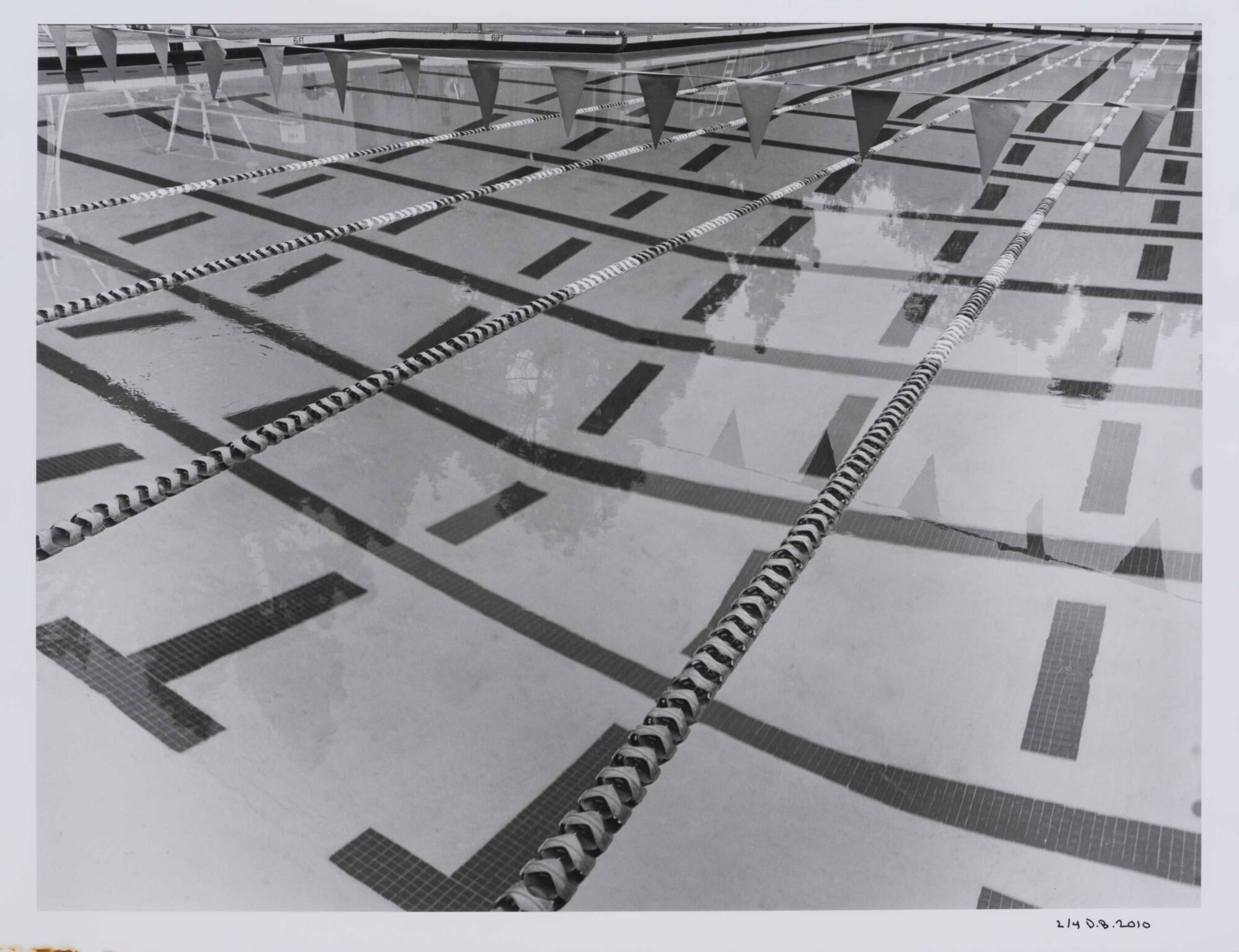 DescriptionImage of a swimming pool with dark lane markers below and a string of flags above.Copyright© Donald Blumberg