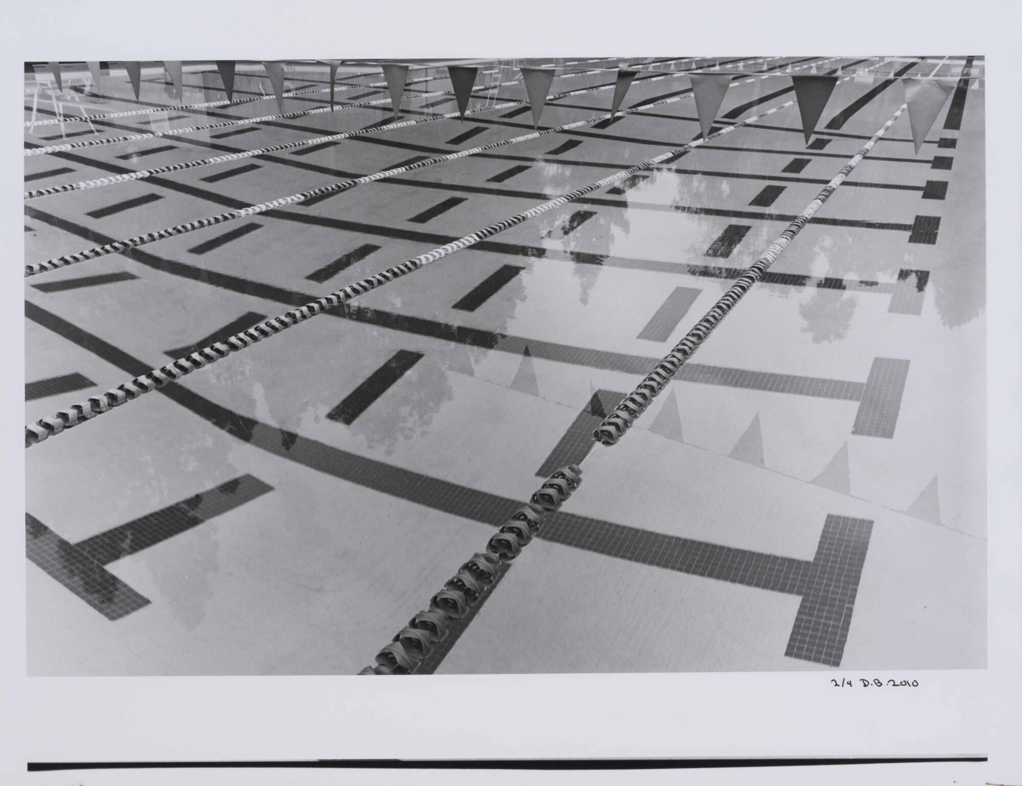 DescriptionImage of a swimming pool with dark lane markers below and a string of flags above.Copyright© Donald Blumberg