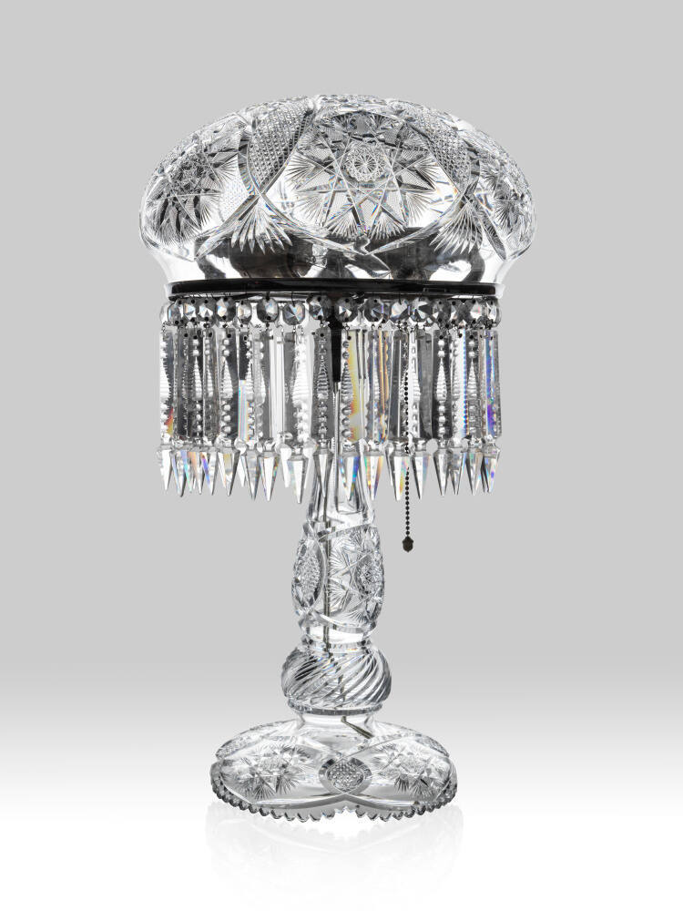 DescriptionTwo part lamp, begins with a top shade in the form of a flattened hemisphere that rests on a silvered metal ring above a narrow cut base. 40 original prisms are attached to the silver ring. The two part prisms are comprised of a hexagon attached to 4 inch long faceted and pointed prisms. The electrified lamp has two outlets with pull chains. Patterns of hob stars and pinwheels identified as the Florence Star pattern by Meriden Glass. The base and stem are hollow, allowing for electric wiring to come up from beneath. Glass is unmarked. There are two sockets, one original and one later. The apparent original socket is marked “Hubbell”.