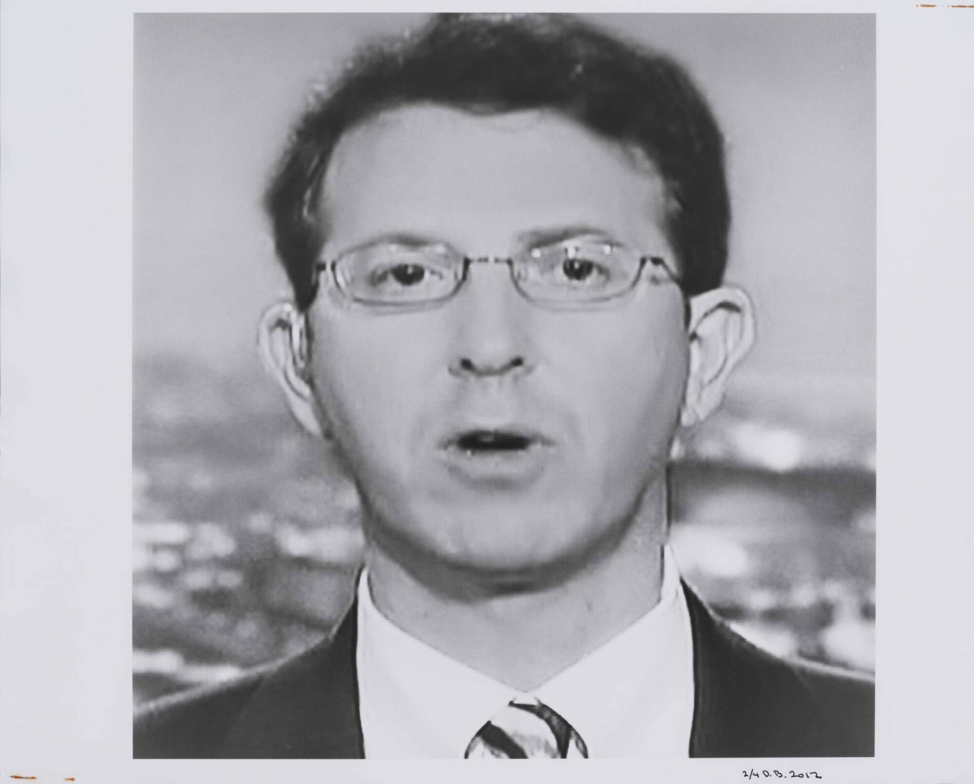 DescriptionClosely cropped portrait from a television screen of a dark hair, glasses, and mouth open.Copyright© Donald Blumberg