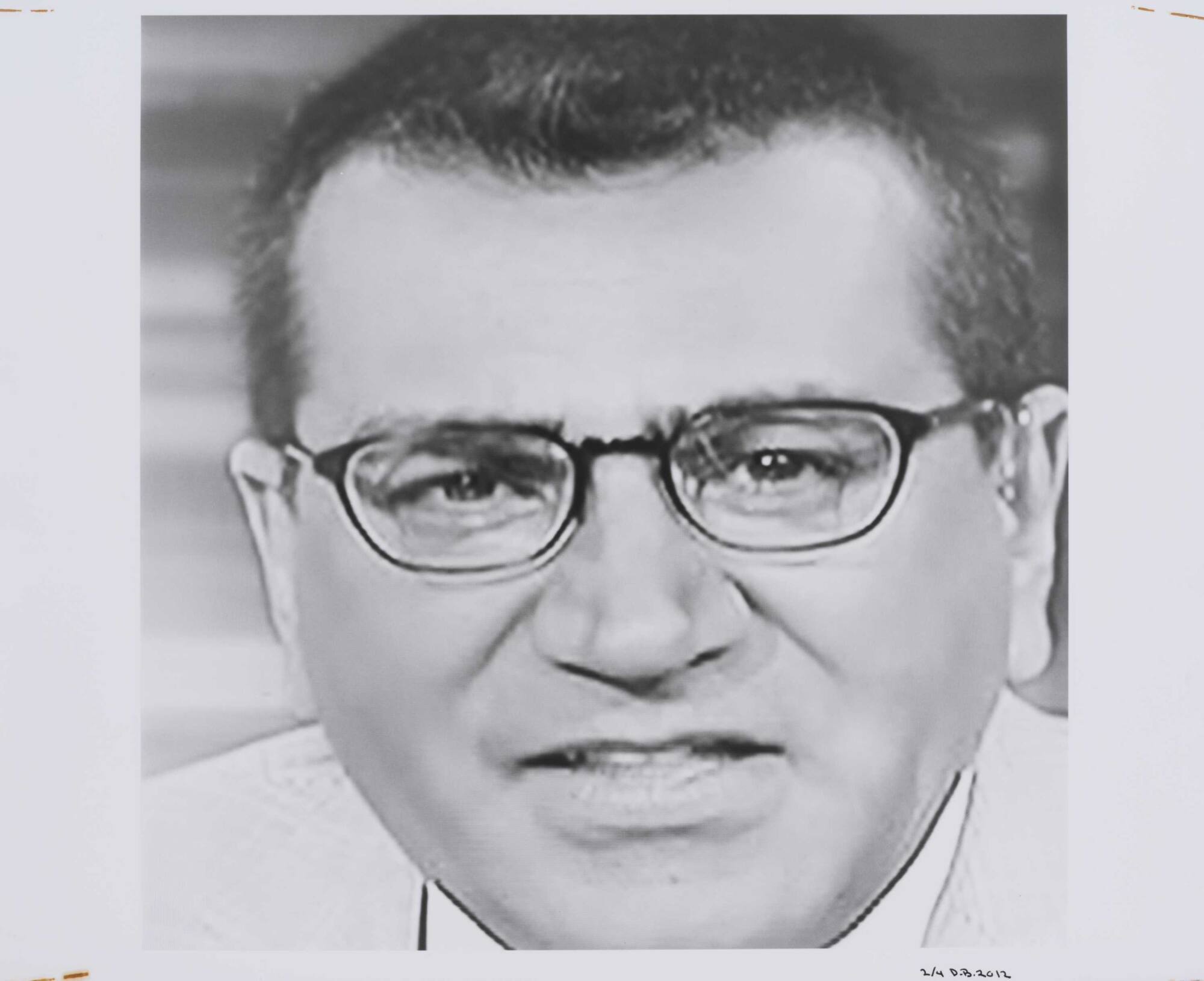 DescriptionClosely cropped portrait from a television screen of a man with dark hair and dark framed glasses.Copyright© Donald Blumberg