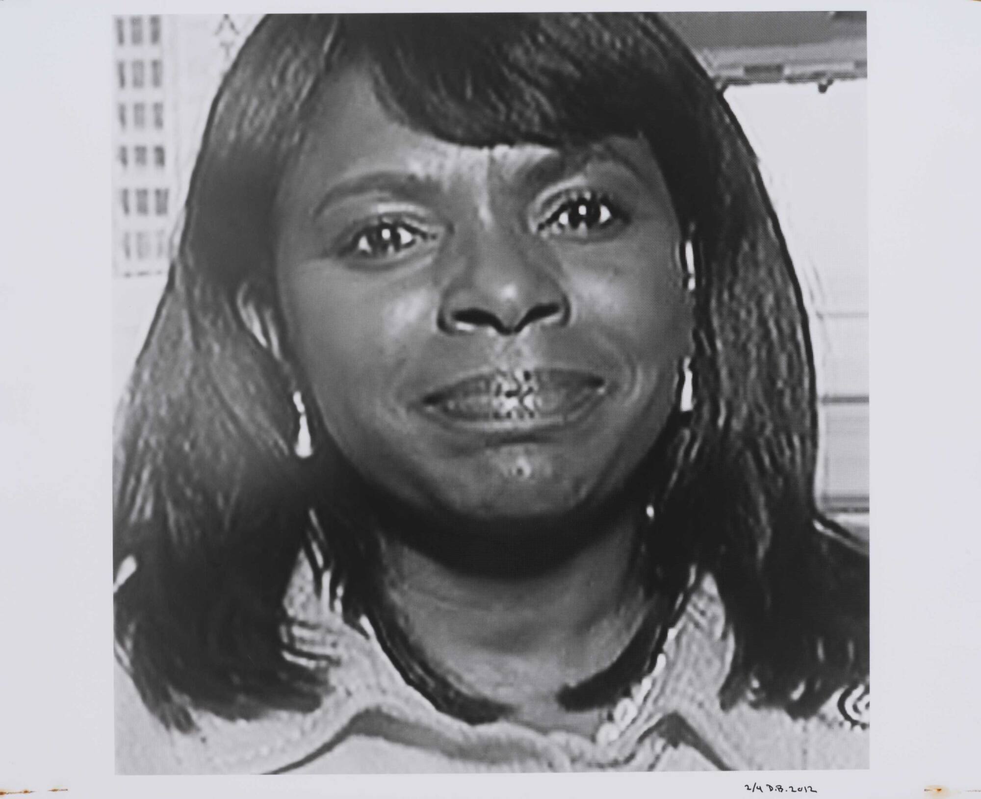 DescriptionClosely cropped portrait from a television screen of an African American woman with straight hair and earrings.Copyright© Donald Blumberg