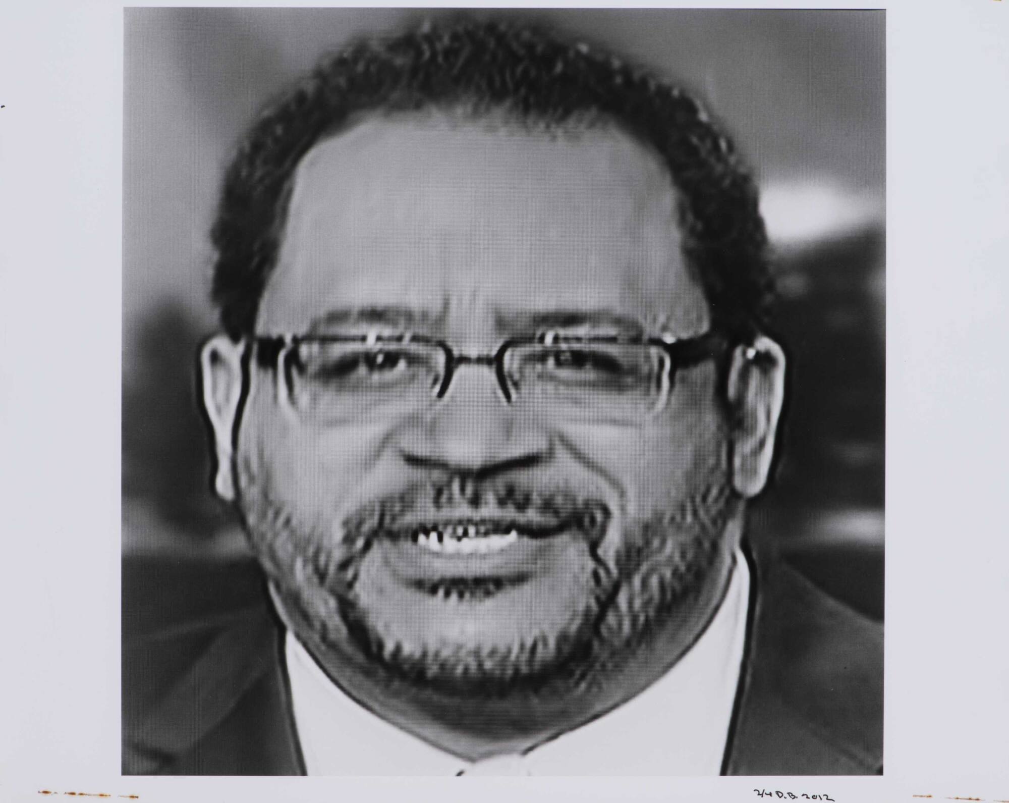 DescriptionClosely cropped portrait from a television screen of a man with short hair, beard, and glasses.Copyright© Donald Blumberg