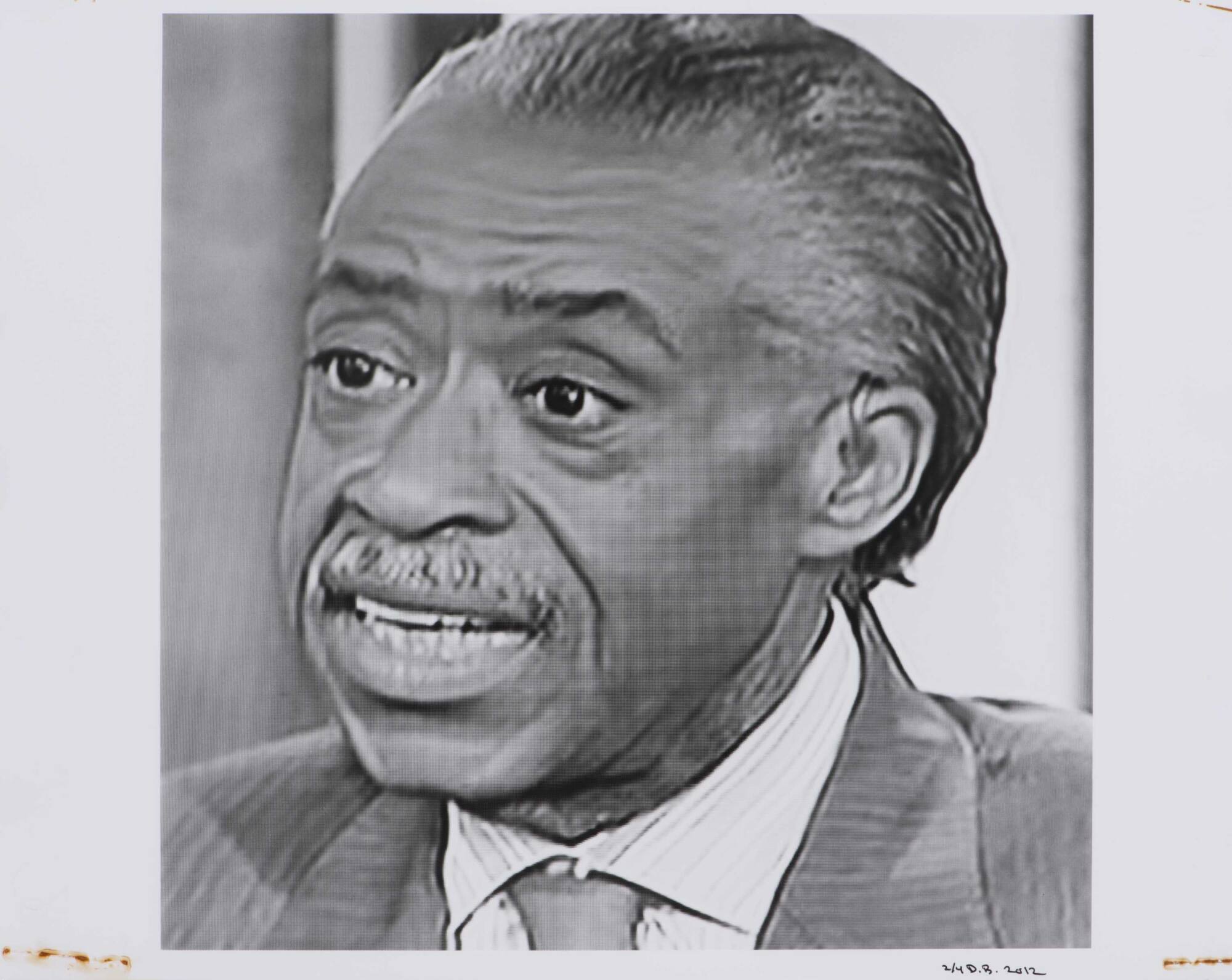 DescriptionClosely cropped portrait from a television screen of a man (Al Sharpton) with mustache looking left.Copyright© Donald Blumberg