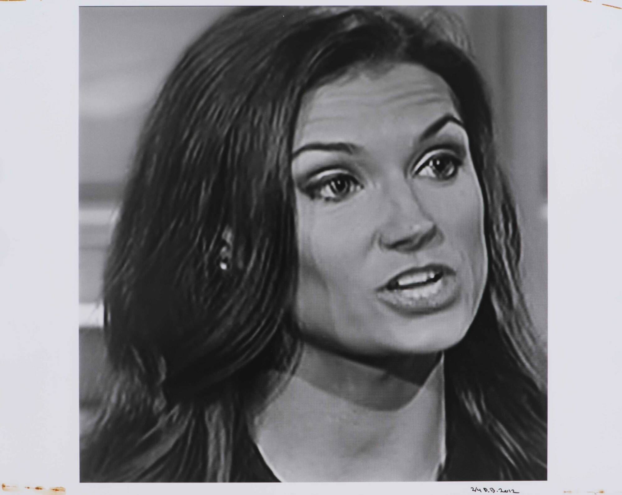 DescriptionClosely cropped portrait from a television screen of a woman with long dark hair talking.Copyright© Donald Blumberg