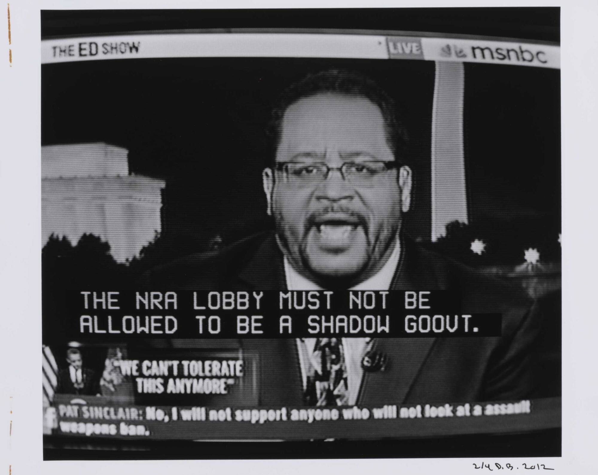 DescriptionImage of a television screen showing a man wearing a suit and tie and subtitles "THE NRA LOBBY MUST NOT BE..."Copyright© Donald Blumberg