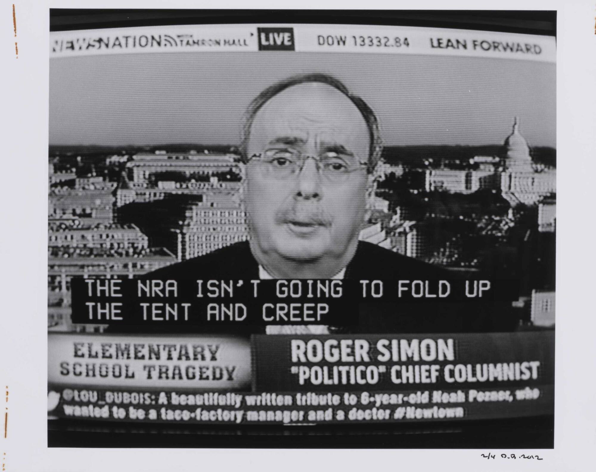 DescriptionImage of a television screen showing a man with short hair and glasses along with subtitles "THE NRA ISN'T GOING TO FOLD UP..."Copyright© Donald Blumberg