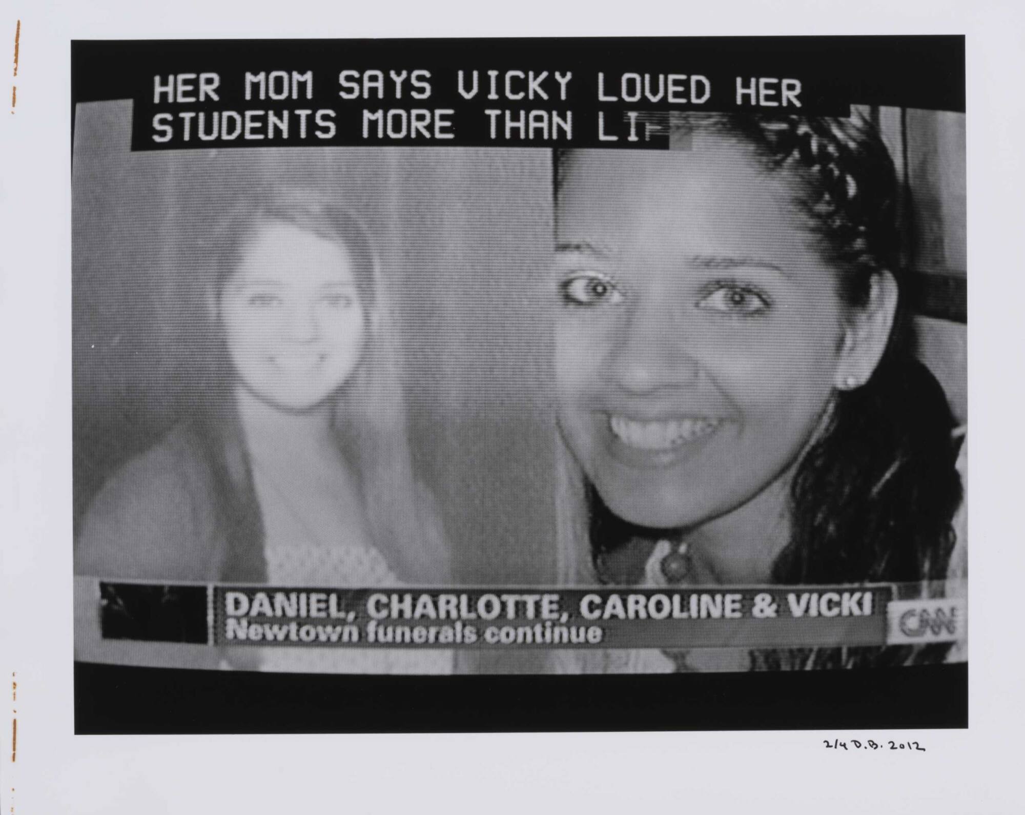 DescriptionImage of a television screen showing two photographs of young girls smiling along with subtitles "HER MOM SAYS VICKY LOVED HER..."Copyright© Donald Blumberg