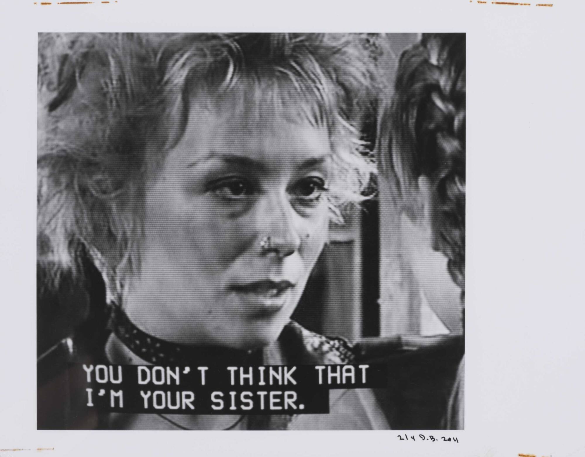 DescriptionPixelated image from a television screen of a woman with a nose ring along with subtitles "YOU DON'T THINK THAT I'M YOUR SISTER."Copyright© Donald Blumberg