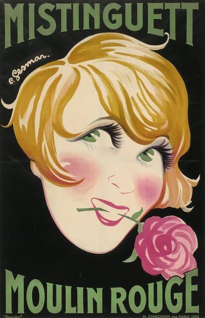 Gallery LabelTousled strawberry blond hair, sparkling green eyes, pink cheeks and lips, and a rose held between bright white teeth—Charles Gesmar’s message writ large is: Mistinguett is young, beautiful, modern and flirtatious, and her performances at the Moulin Rouge are thrilling. This poster is not an advertisement for a particular performance, but rather for Mistinguett herself. Although she began as a flower seller and ballad singer, she soon became famous for her risqué cabaret routines. In 1919, her legs were reportedly insured for the astonishing sum of 500,000 francs, and she was the highest paid female performer in the world. Among Mistinguett’s many lovers was the much younger Maurice Chevalier.