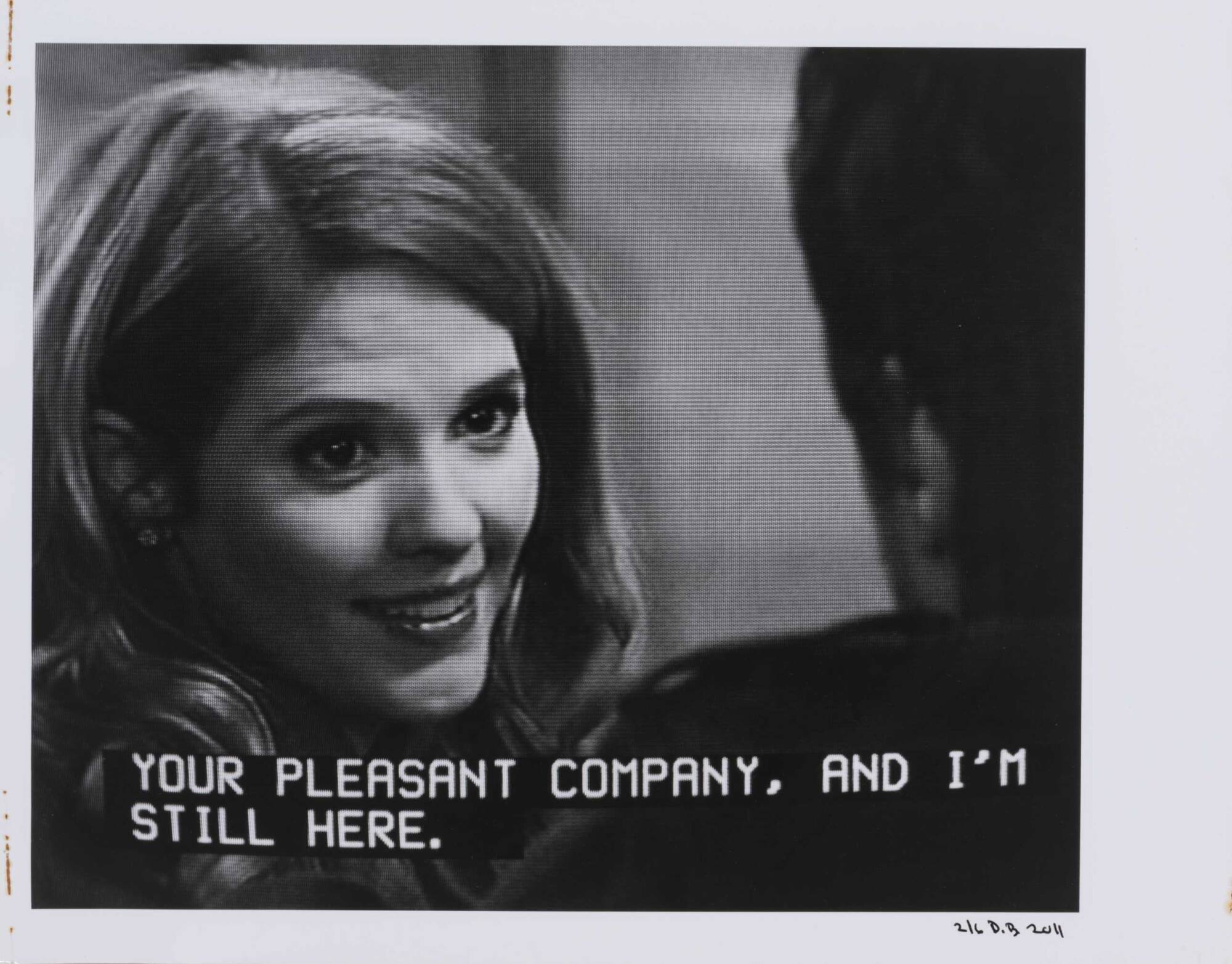 DescriptionPixelated image from a television screen of a woman smiling along with subtitles "YOUR PLEASANT COMPANY, AND I'M STILL HERE."Copyright© Donald Blumberg