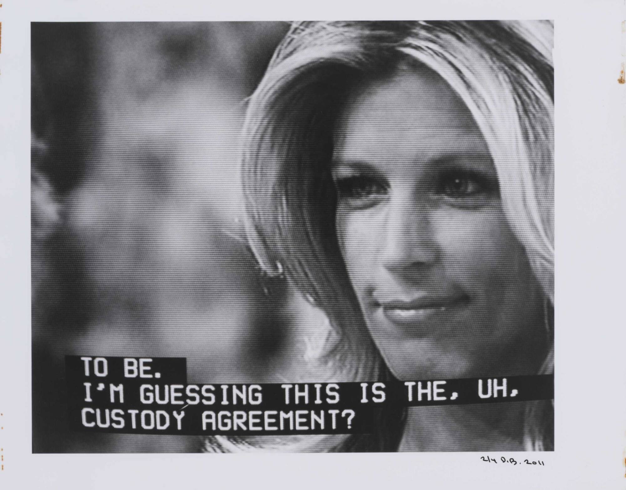 DescriptionPixelated image from a television screen of a woman with a slight smile along with subtitles "TO BE. I'M GUESSING THAT IS THE, UH, CUSTODY AGREEMENT?"Copyright© Donald Blumberg