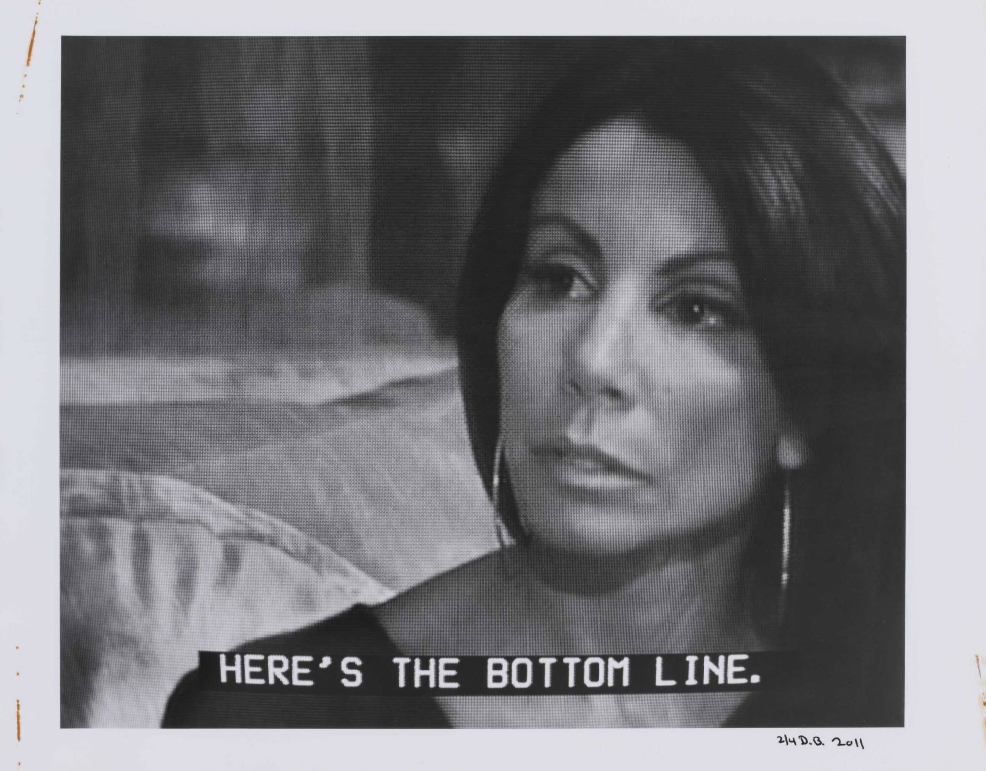DescriptionPixelated image from a television screen of a woman with long, dark hair and hoop earrings along with subtitles "HERE'S THE BOTTOM LINE."Copyright© Donald Blumberg