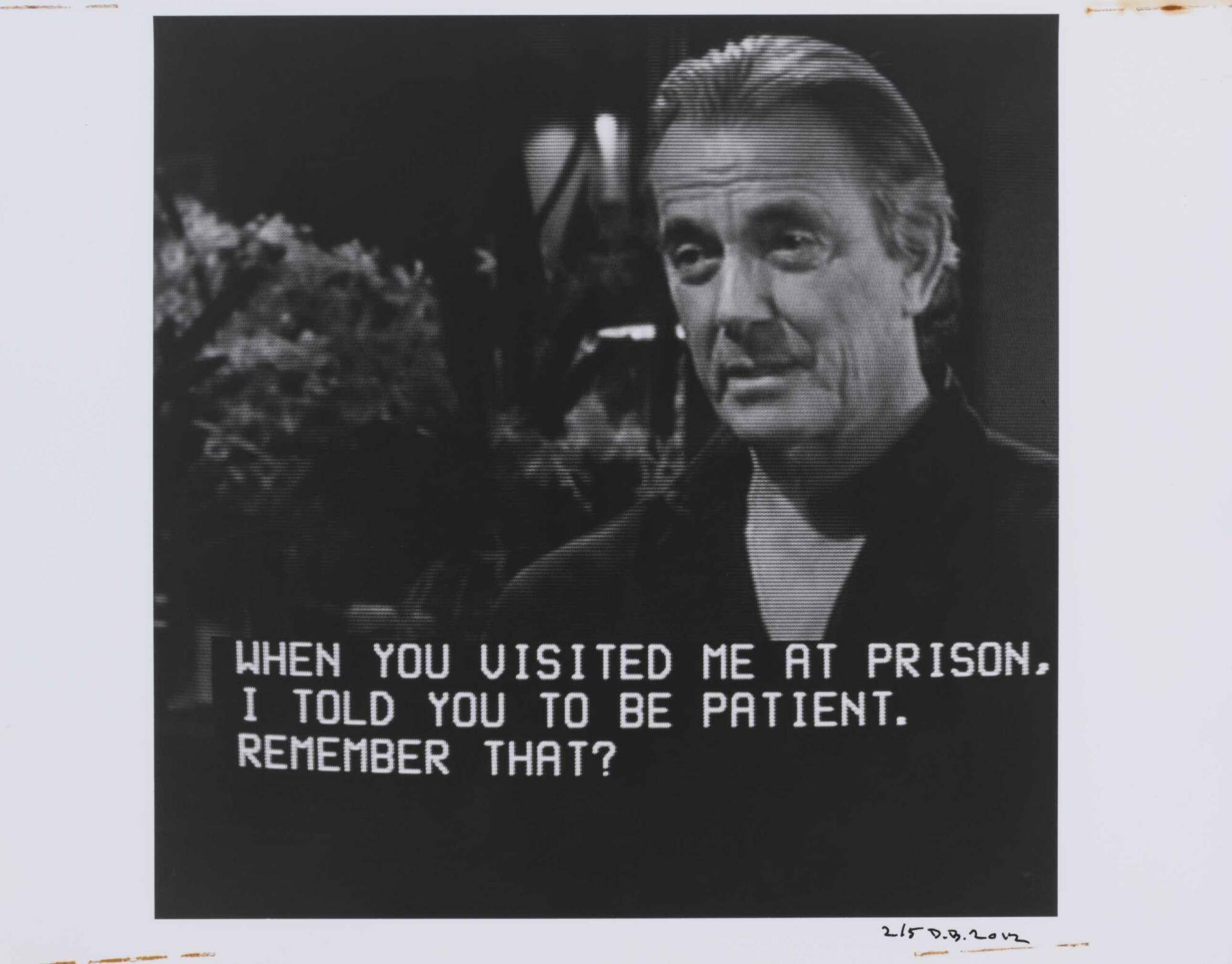DescriptionPixelated image from a television screen of a man with unbuttoned shirt along with subtitles "WHEN YOU VISITED ME AT PRISION, I TOLD YOU TO BE PATIENT, REMEMBER THAT?"Copyright© Donald Blumberg