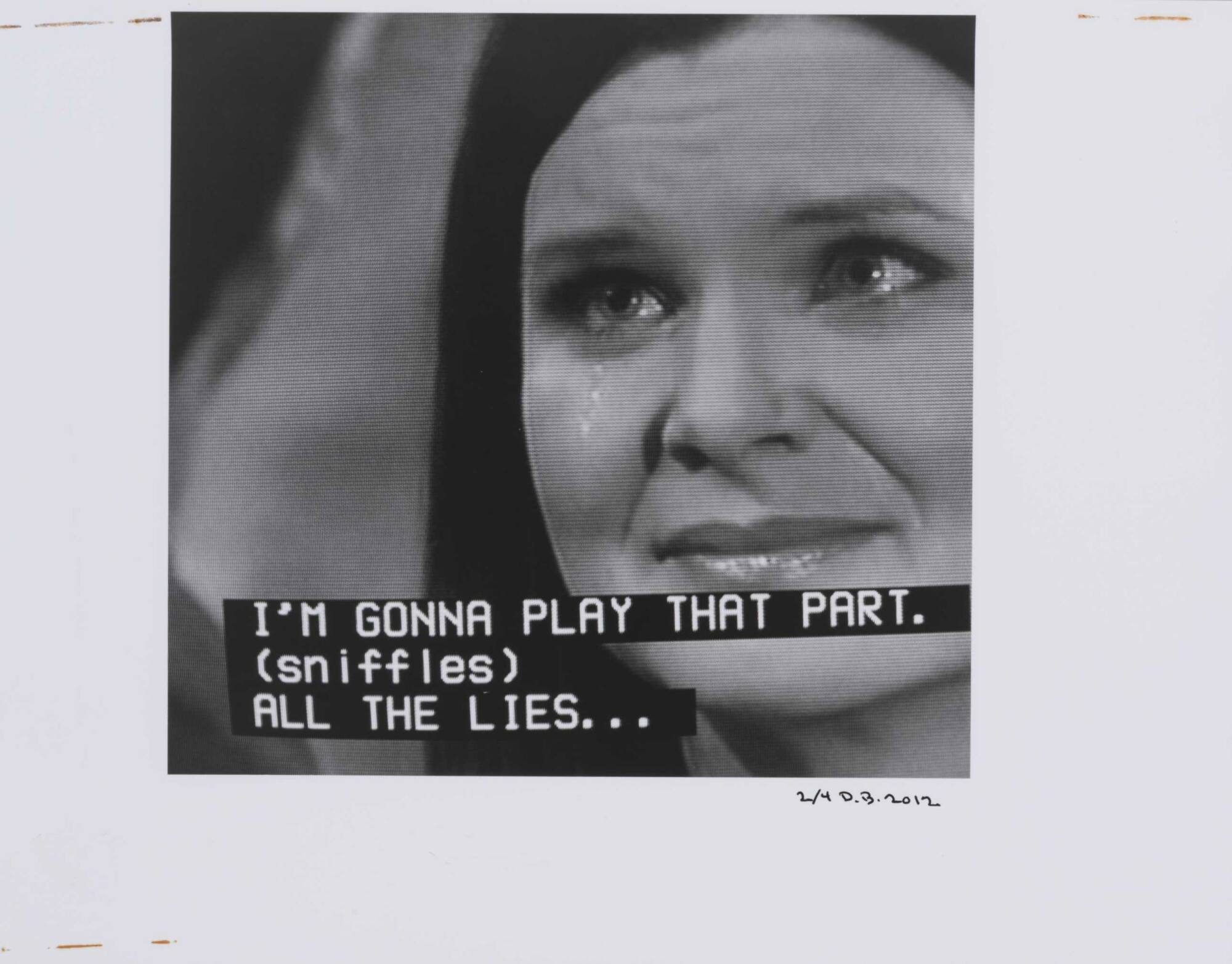 DescriptionPixelated image from a television screen of a woman crying along with subtitles "I'M GONNA PLAY THAT PART. (sniffles) ALL THE LIES..."Copyright© Donald Blumberg