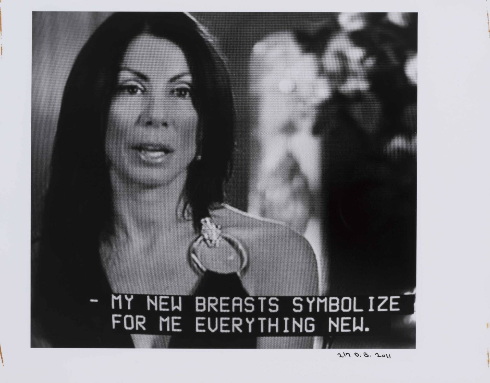 DescriptionPixelated image from a television screen of a woman with long dark hair and subtitles "- MY NEW BREASTS SYMBOLIZE FOR ME EVERYTHING NEW."Copyright© Donald Blumberg
