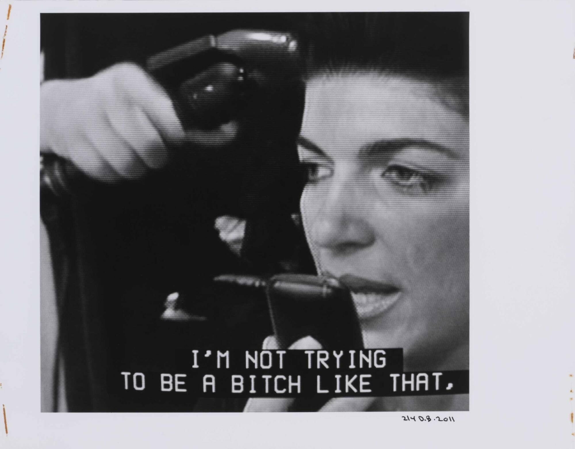 DescriptionPixelated image from a television screen of a woman holding a cell phone in front of her mouth and subtitles "I'M NOT TRYING TO BE A BITCH LIKE THAT."Copyright© Donald Blumberg