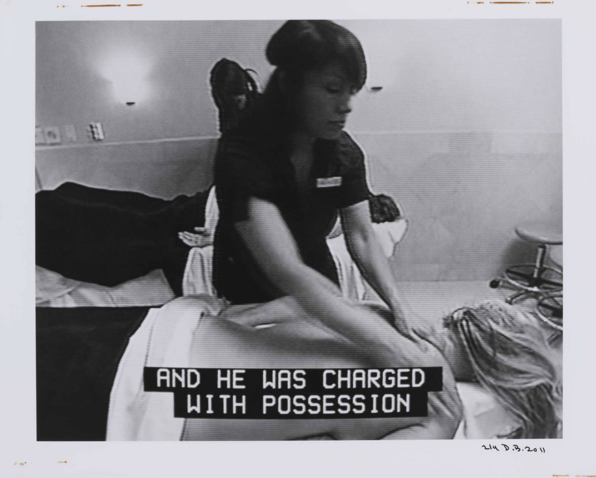 DescriptionPixelated image from a television screen of a woman lying on a table getting a massage along with subtitles "AND HE WAS CHARGED WITH POSSESSION."Copyright© Donald Blumberg
