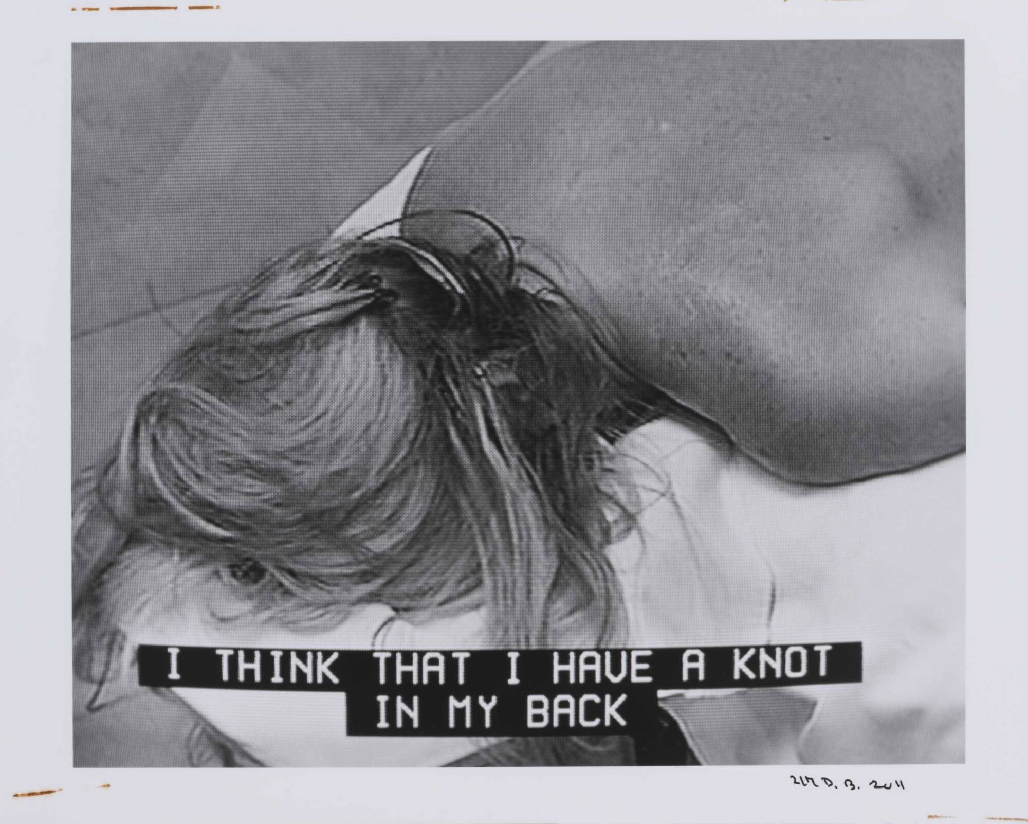 DescriptionPixelated image from a television screen of a woman lying on massage table with back exposed along with subtitles "I THINK THAT I HAVE A KNOT IN MY BACK."Copyright© Donald Blumberg