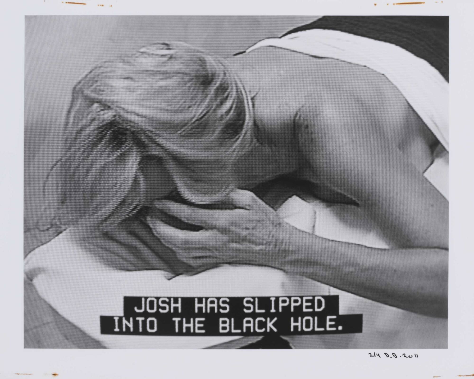 DescriptionPixelated image from a television screen of a woman lying on massage table covered by a sheet along with subtitles "JOSH HAS SLIPPED INTO THE BALCK HOLE."Copyright© Donald Blumberg