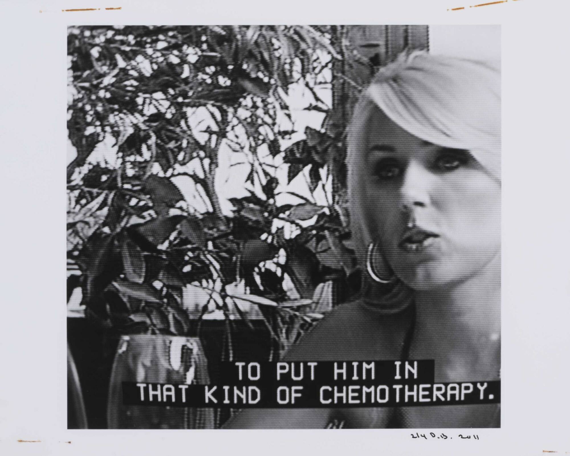 DescriptionPixelated image from a television screen of a woman with foliage behind her and subtitles "TO PUT HIM IN THAT KIND OF CHEMOTHERAPY."Copyright© Donald Blumberg
