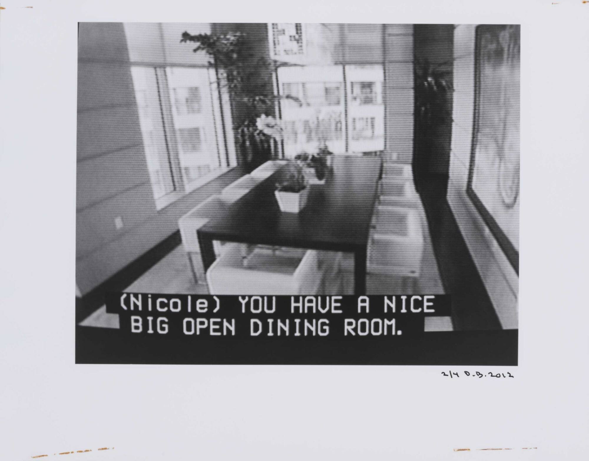 DescriptionPixelated image from a television screen of a dining room table and chairs along with subtitles "{Nicole} YOU HAVE A NICE BIG OPEN DINING ROOM."Copyright© Donald Blumberg