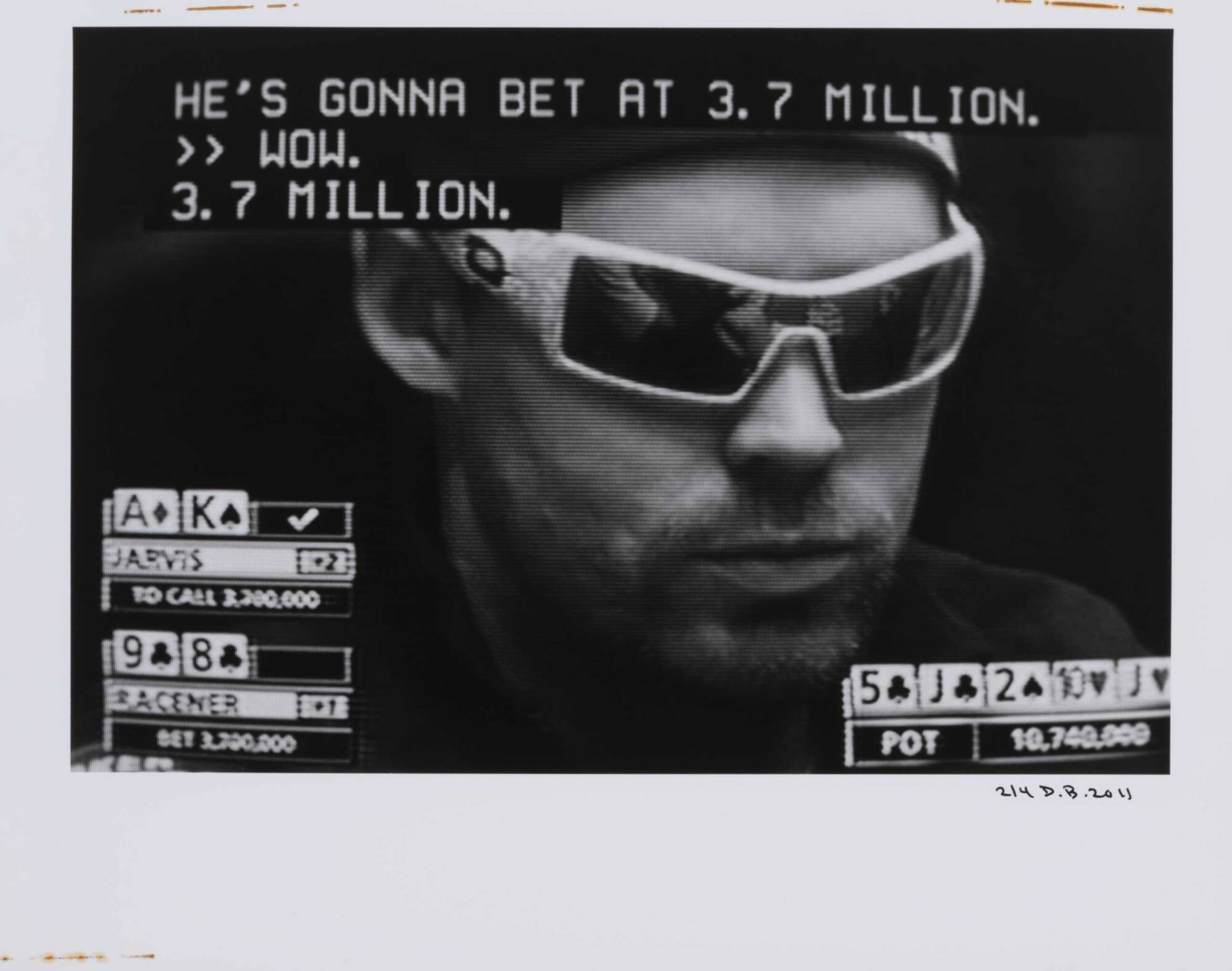 DescriptionPixelated image from a television screen of a man with goatee and sunglasses along with subtitles "HE'S GONNA BET AT 3.7 MILLION. >>WOW. 3.7 MILLION."Copyright© Donald Blumberg