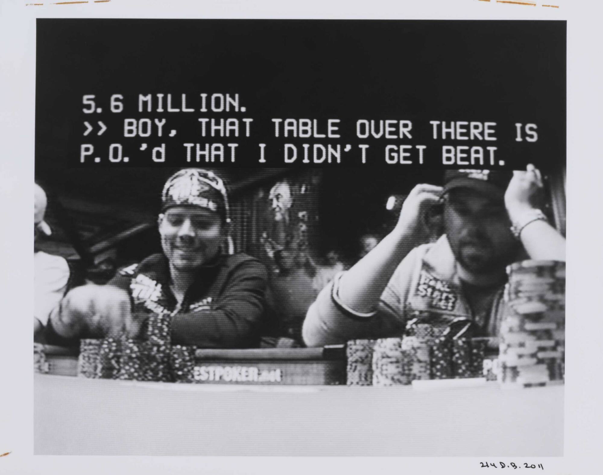 DescriptionPixelated image from a television screen of two men seated at a poker table with chips stacked in front of them and subtitles "5.6 MILLION. >>BOY, THAT TABLE OVER THERE IS P.O.'d THAT I DIDN'T GET BEAT."Copyright© Donald Blumberg