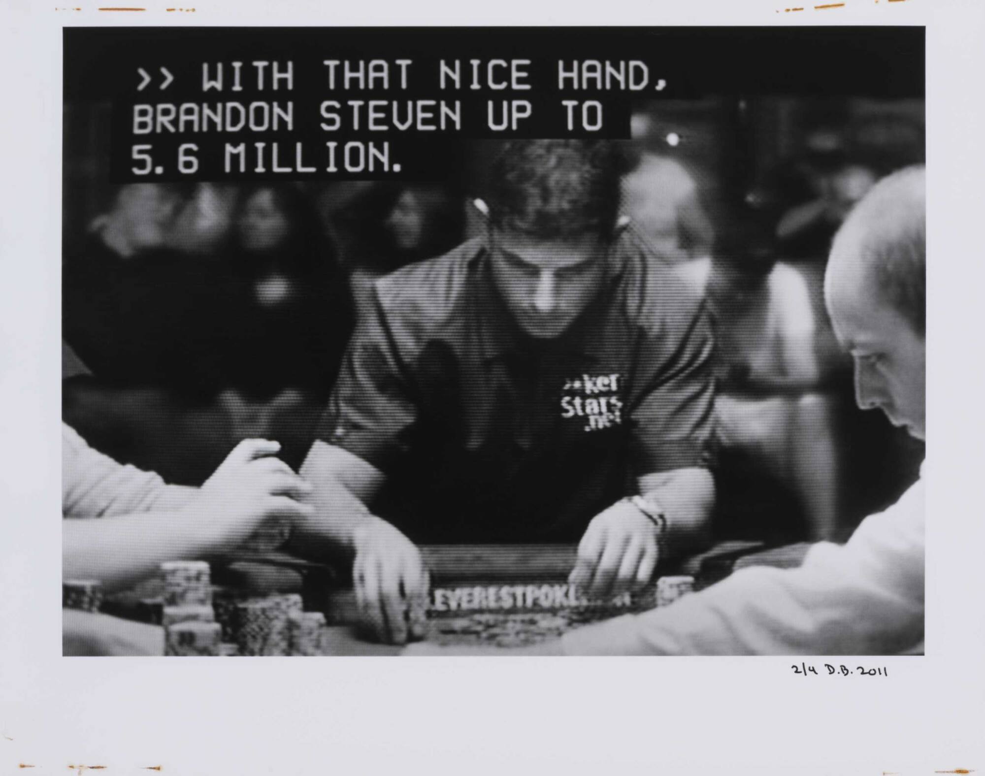 DescriptionPixelated image from a television screen of a man leaning over a poker table wearing a pokerstars.net shirt and subtitles ">>WITH THAT NICE HAND, BRANDON STEVEN UP TO 5.6 MILLION."Copyright© Donald Blumberg