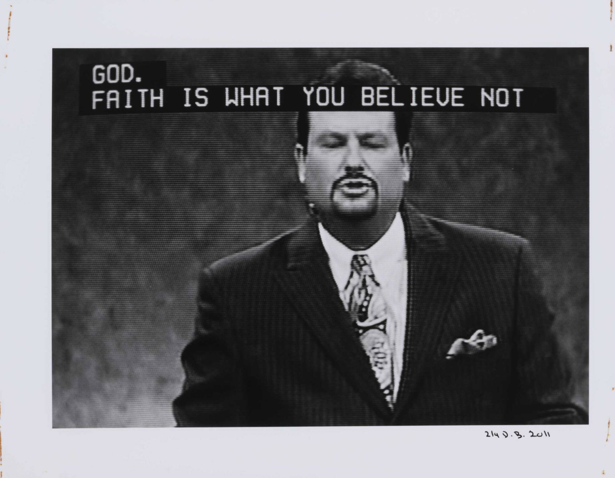 DescriptionPixelated image from a television screen of a man with a goatee wearing a suit and tie along with subtitles "GOD. FAITH IS WHAT YOU BELIEVE NOT"Copyright© Donald Blumberg