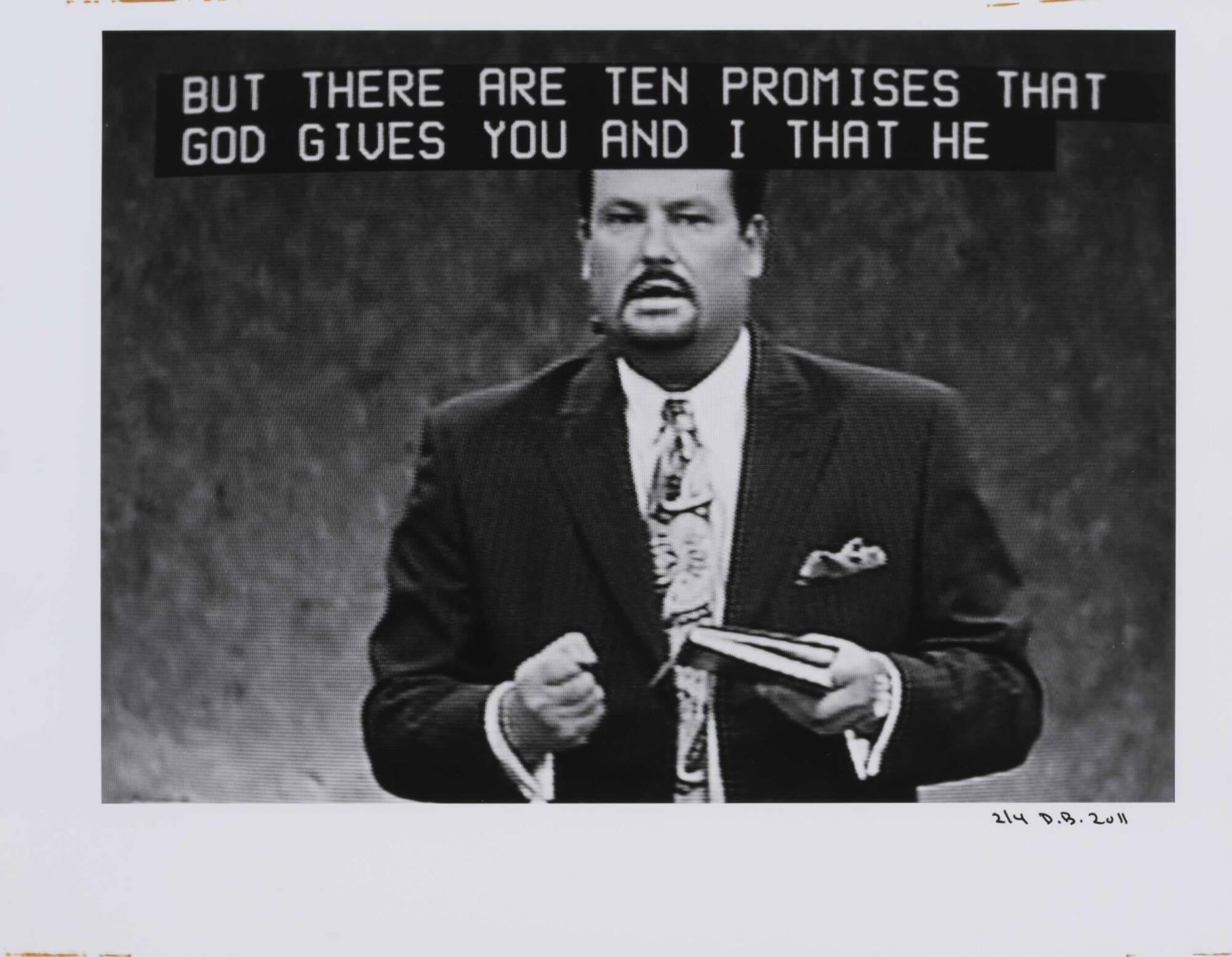 DescriptionPixelated image from a television screen of a man wearing a suit and tie and clenching his fist; subtitles "BUT THERE ARE TEN PROMISES THAT GOD GIVES YOU AND I THAT HE".Copyright© Donald Blumberg