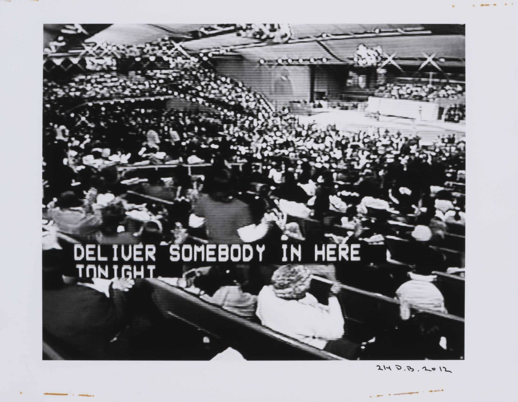 DescriptionPixelated image from a television screen of a crowded amphitheater along with subtitles "DELIVER SOMEBODY IN HERE TONIGHT".Copyright© Donald Blumberg