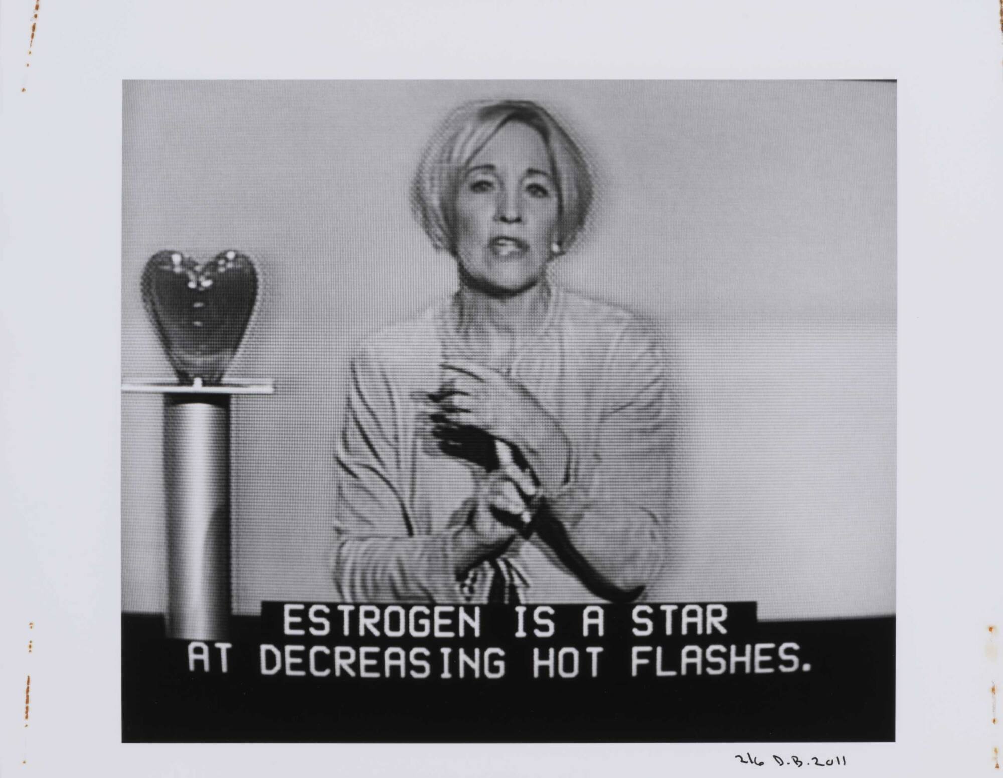 DescriptionPixelated image from a television screen of a woman with short hair speaking along with subtitles "ESTROGEN IS A STAR AT DECREASING HOT FLASHES."Copyright© Donald Blumberg