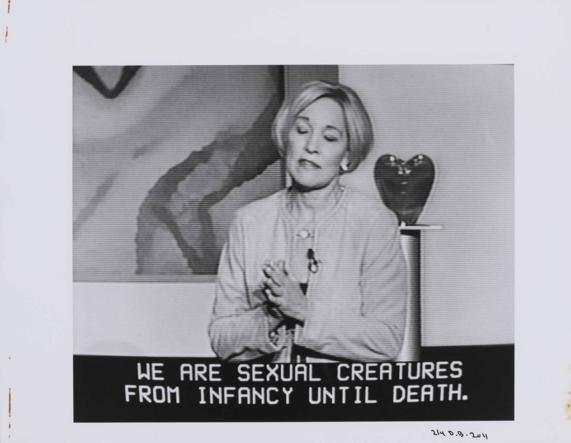 DescriptionPixelated image from a television screen of a woman with short hair speaking along with subtitles "WE ARE SEXUAL CREATURES FROM INFANCY UNTIL DEATH."Copyright© Donald Blumberg