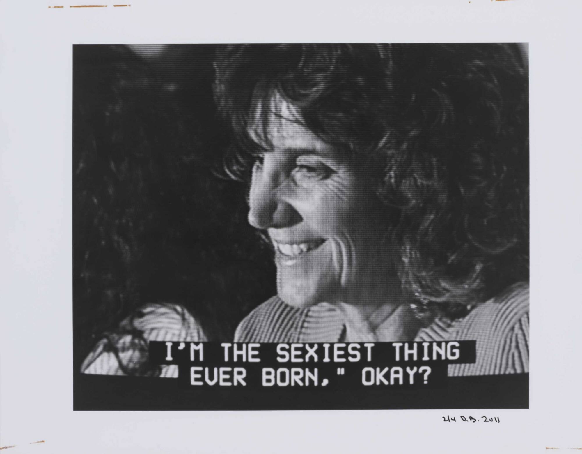 DescriptionPixelated image from a television screen of a woman with short hair laughing along with subtitles "I'M THE SEXIEST THING EVER BORN," OKAY?"Copyright© Donald Blumberg
