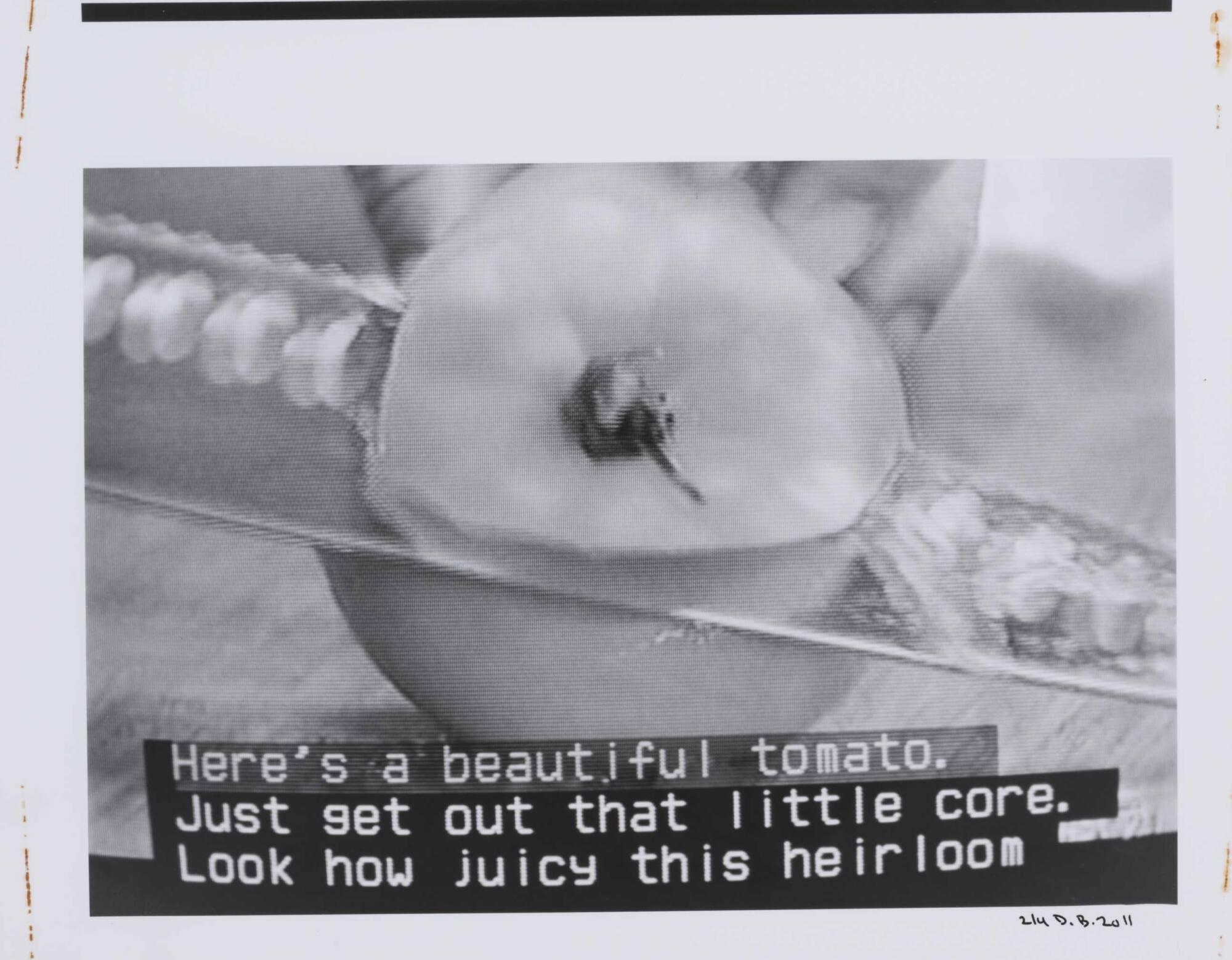 DescriptionPixelated image from a television screen of a knife cutting into a tomato along with subtitles "Here's a beautiful tomato. Just get out that little core. Look how juicy this heirloom".Copyright© Donald Blumberg