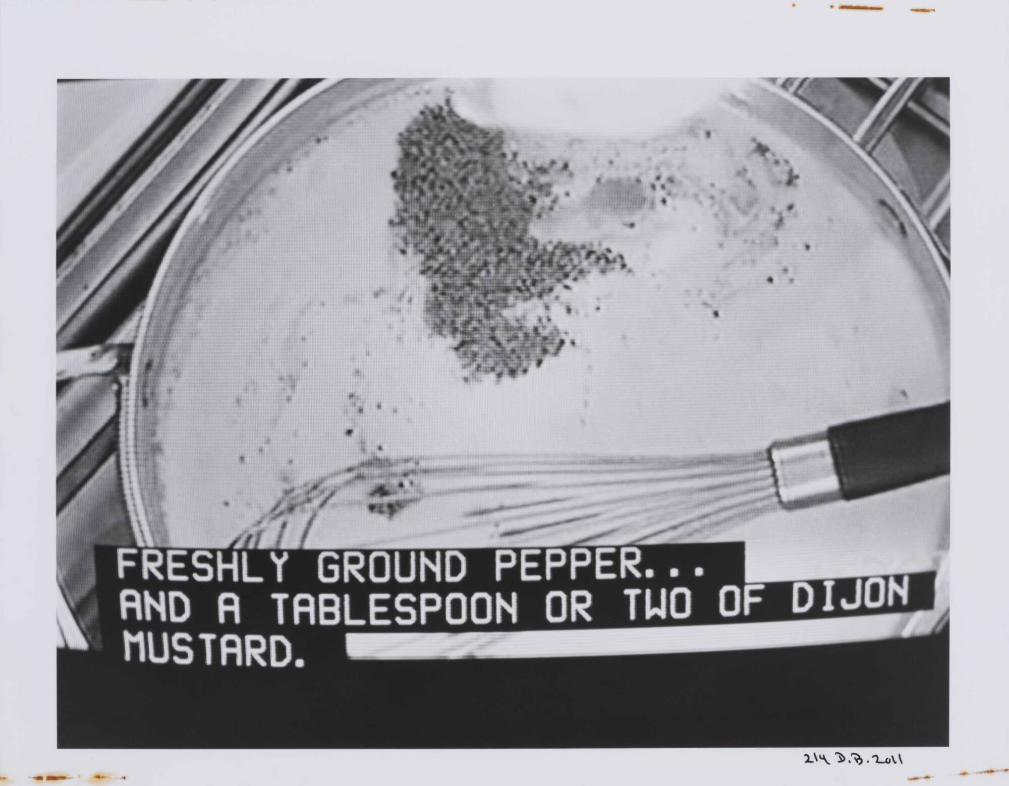 DescriptionPixelated image from a television screen of a whisk mixing pepper into liquid along with subtitles "FRESHLY GROUND PEPPER...AND A TABLESPOON OR TWO OF DIJON MUSTARD."Copyright© Donald Blumberg