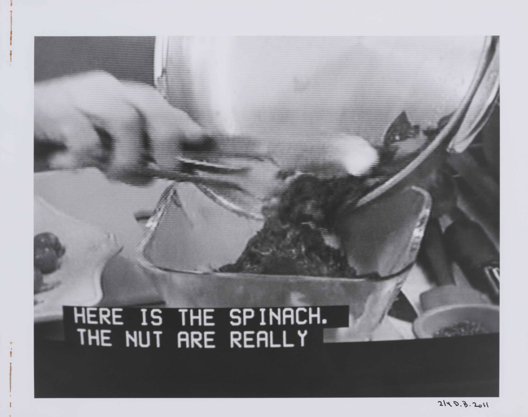 DescriptionPixelated image from a television screen showing a hand scraping spinach out of a skillet and into a bowl along with subtitles "HERE IS THE SPINACH. THE NUT ARE REALLY".Copyright© Donald Blumberg