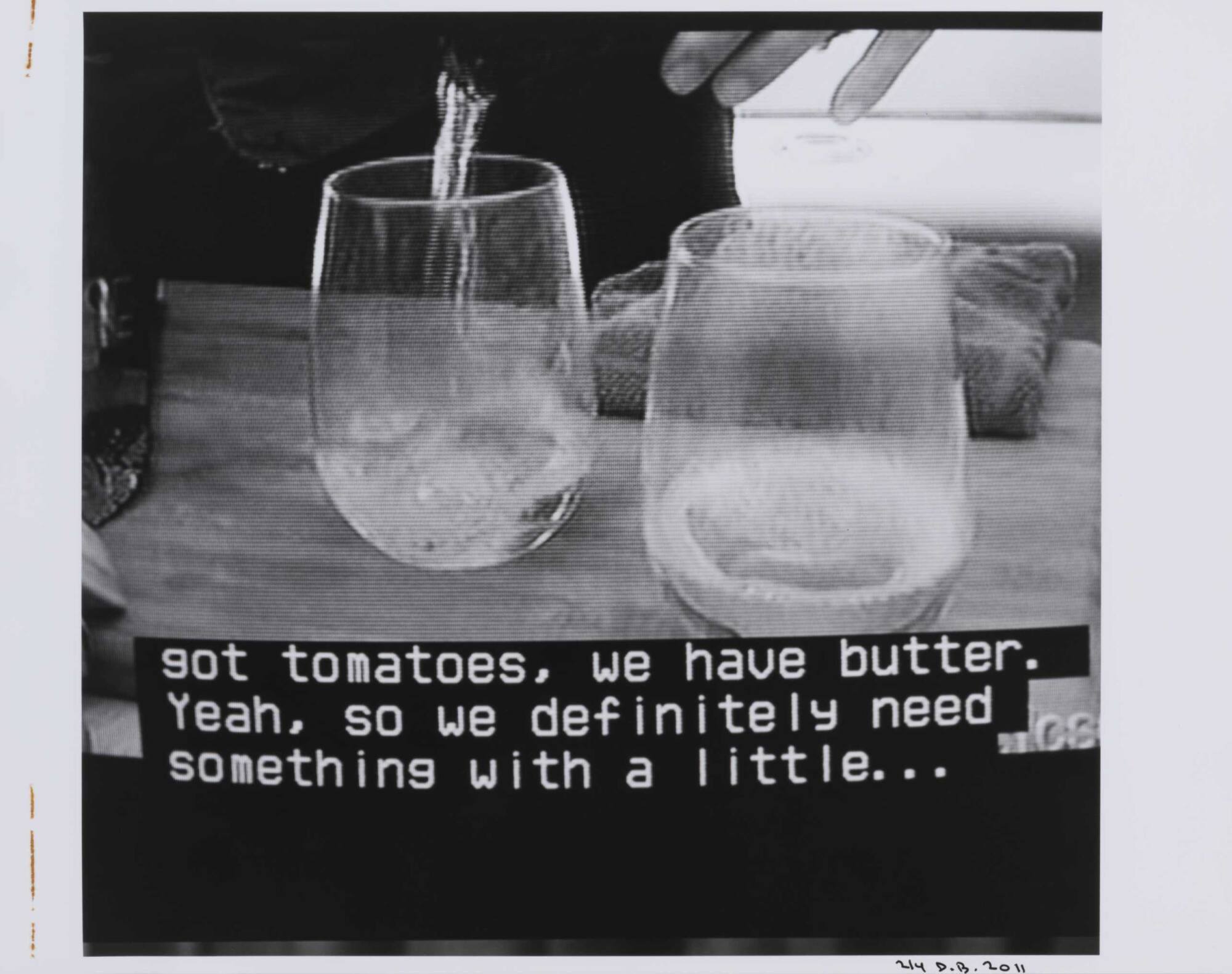 DescriptionPixelated image from a television screen showing two glasses along with subtitles "got tomatoes, we have butter. Yeah, so we definitely need something with a little...".Copyright© Donald Blumberg